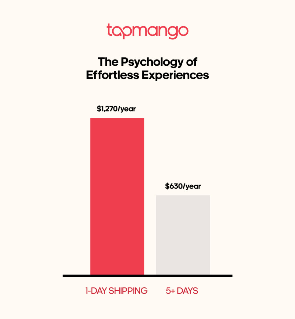 Take Amazon, for example. Customers who opt for one-day shipping spend nearly twice as much per year ($1,270) as those who wait five days or longer ($630). The easier it is to buy, the more they buy.
